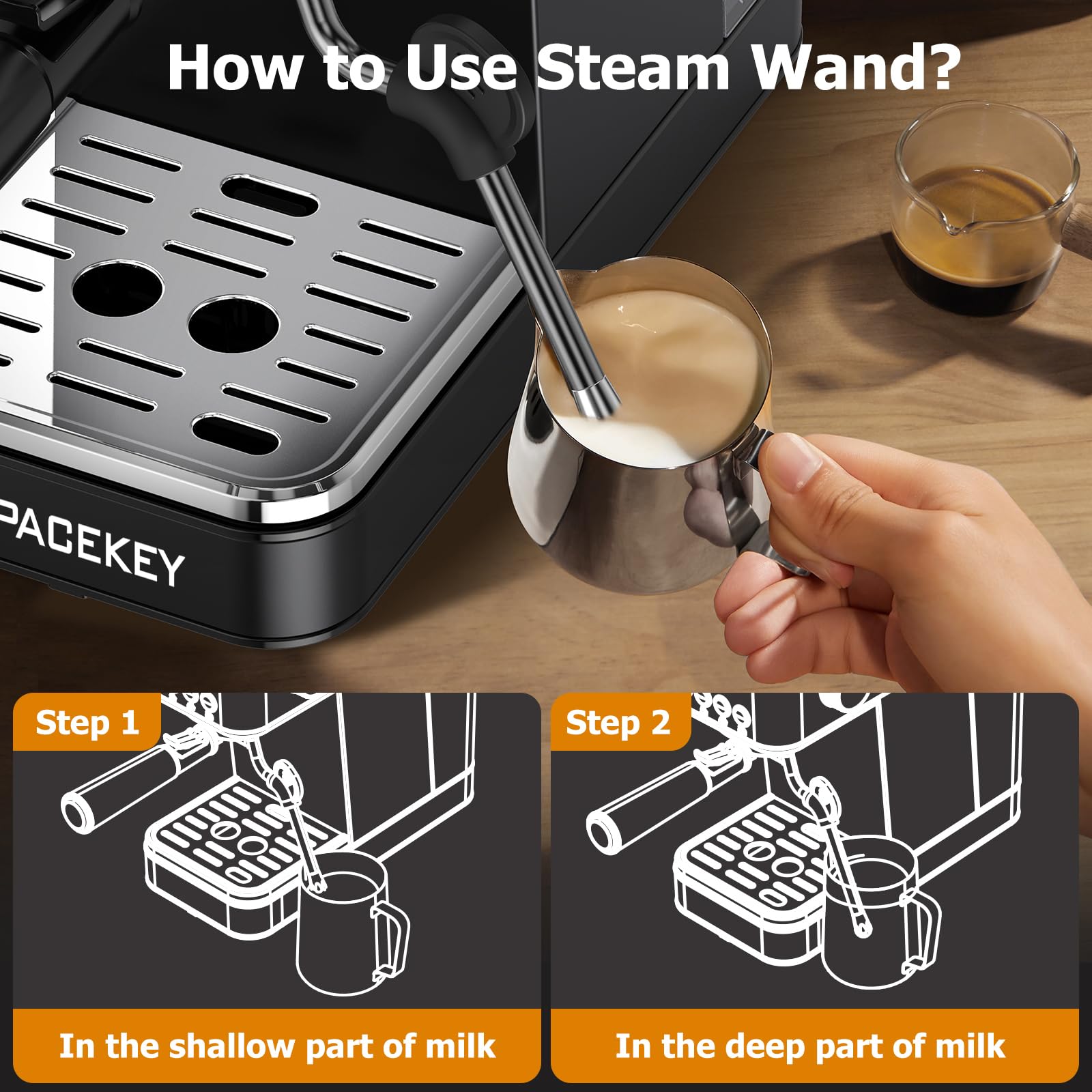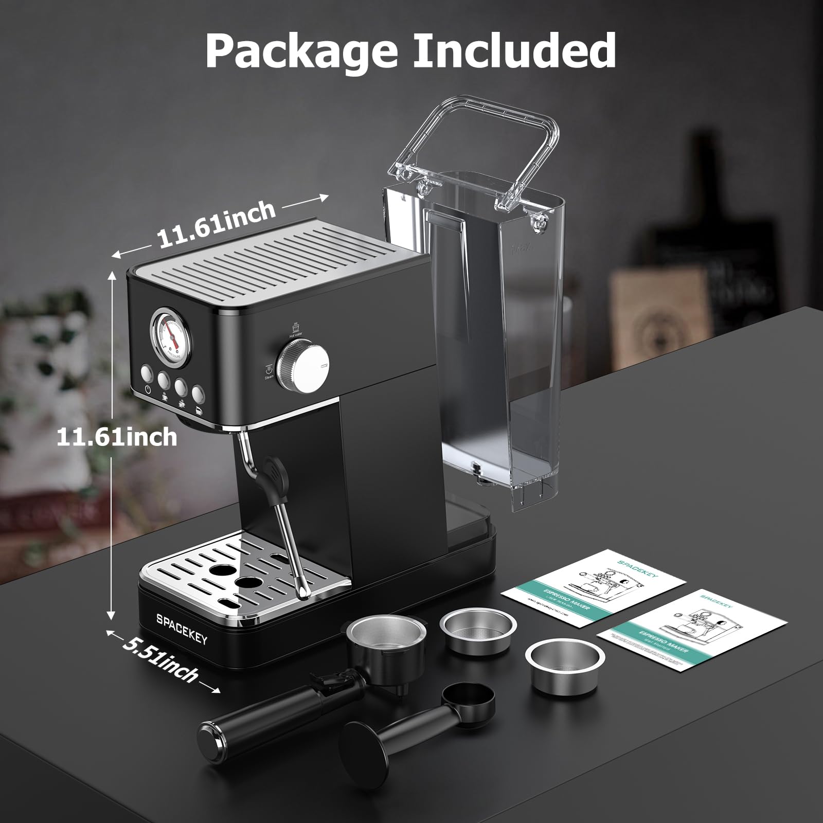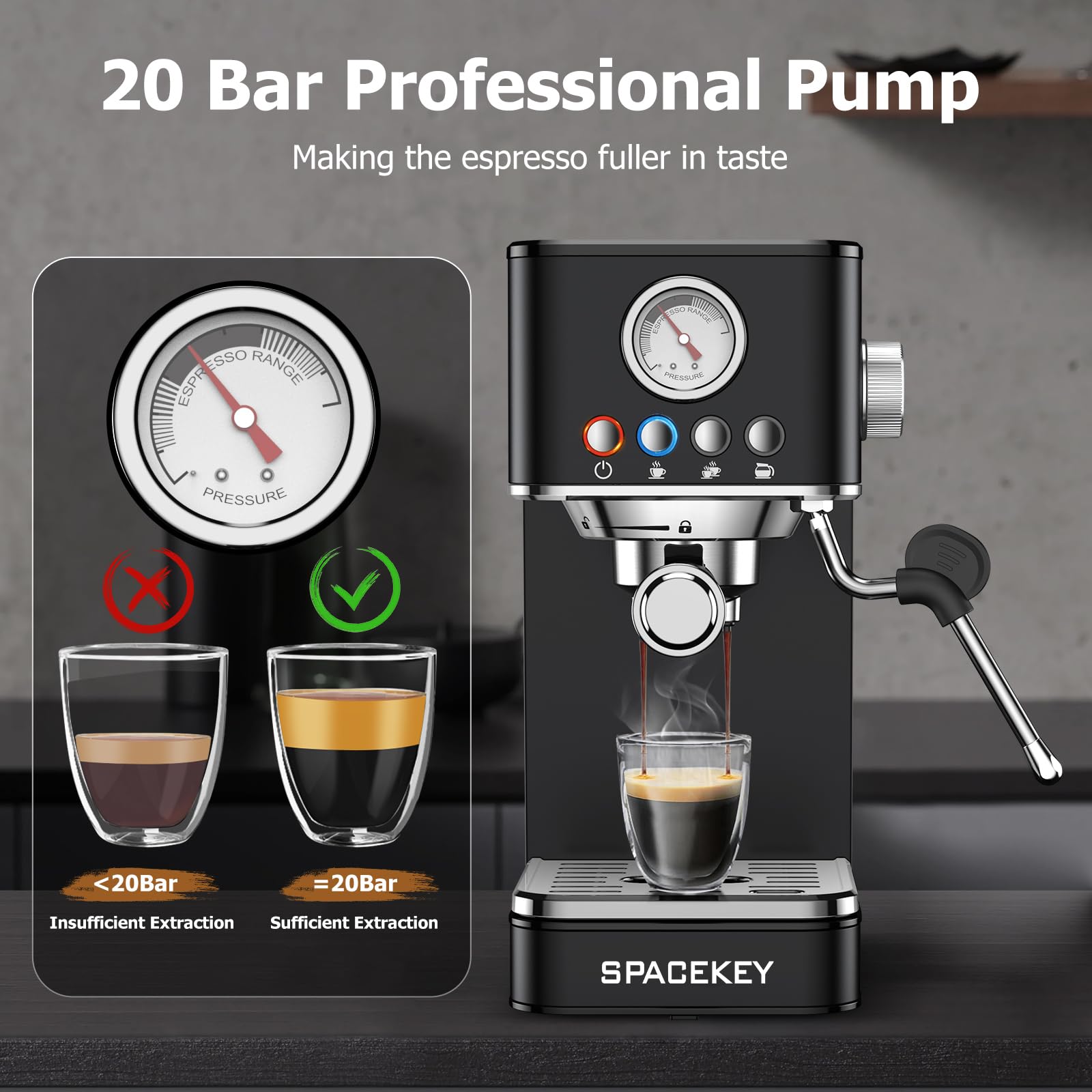 - 20 BAR PROFESSIONAL PUMP: 1200w espresso maker is equipped with 20 bar professional Italian pump, and SPACEKEY espresso machine has a smart pre-soak system, so that the ground coffee powder in the full pressure extraction before the low pressure delivery of water to moisten a more uniform extraction, and the PID intelligent control of water temperature, so that your espresso more delicious.