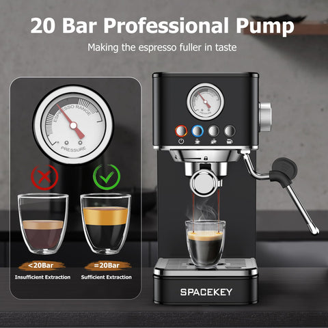 20 BAR PROFESSIONAL PUMP: 1200w espresso maker is equipped with 20 bar professional Italian pump, and SPACEKEY espresso machine has a smart pre-soak system, so that the ground coffee powder in the full pressure extraction before the low pressure delivery of water to moisten a more uniform extraction, and the PID intelligent control of water temperature, so that your espresso more delicious.