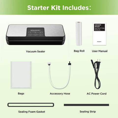 Full Starter Kits: You will receive 1x vacuum sealer machine, 1x vacuum rolls (9.8"x9.8'), 10x pre-cut bags (BPA free, 7.8"x9.8"), 1x user manual, 1x Air suction hose, 1x AC power cord, 1x sealing gaskets, 1x Sealing strip. If you have any questions with the food sealer machine, please tell us, we will help until your problem is solved with a satisfying result